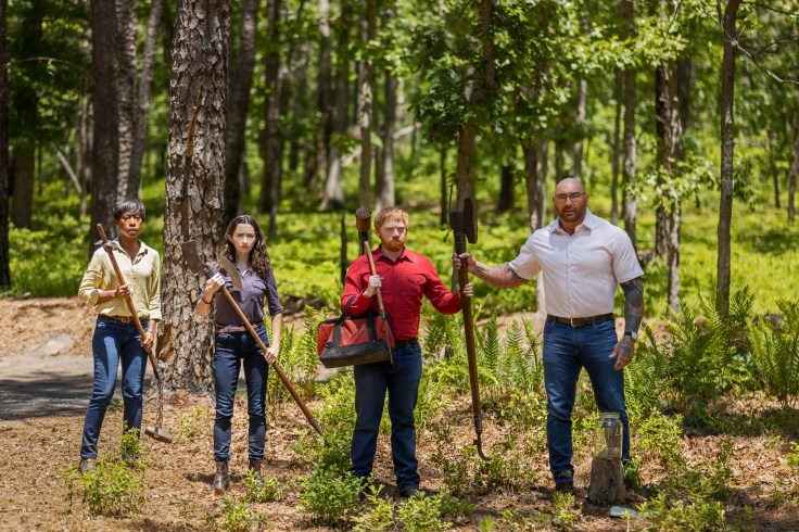 Andrew (Ben Aldridge) and Eric (Jonathan Groff) have rented a rustic cottage in an idyllic forest setting. Ready to relax with their almost 8-year-old daughter Wen (Kristen Cui), the family doesn’t expect anyone to come near their remote family vacation. Their solitude is broken when a large man named Leonard (Dave Bautista) approaches Wen as she catches grasshoppers, telling her that his heart is broken because of what he has to do. This task is the “most important job in the history of the world,” and only Wen and her dads can help. He’s joined by Adriane (Abby Quinn), Redmond (Rupert Grint), and Sabrina (Nikki Amuka-Bird), who have all been brought together by visions of the apocalypse. After Wen warns her dads, the four harbingers break into the home and hold the trio hostage, waiting for them to decide who will be a sacrifice to save the end of the world.